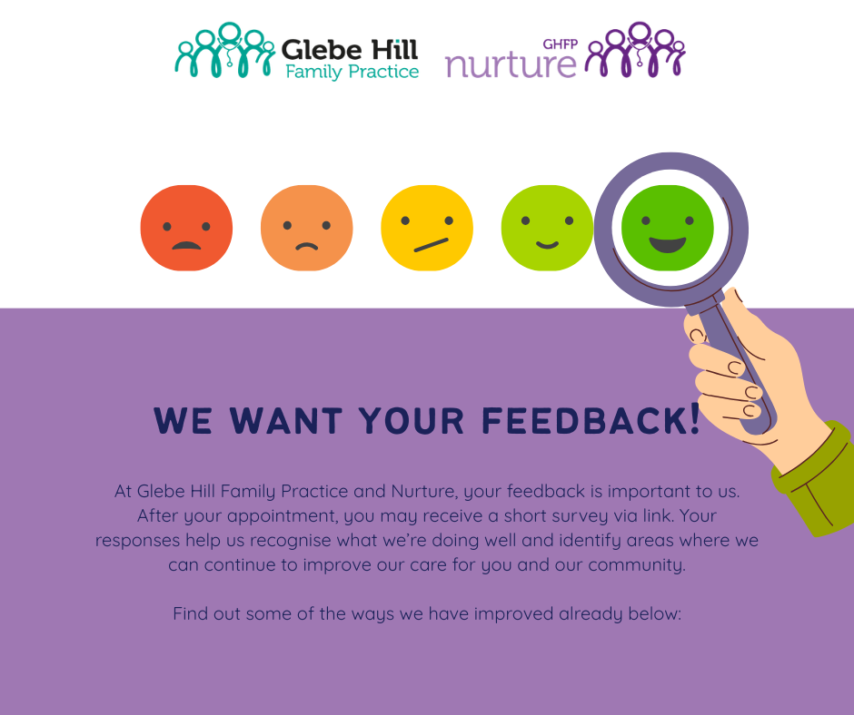 “The entrance door always confuses me” – We are currently reviewing and updating signage and visibility of the entrance to Nurture, working with a graphic designer to make the practice more visible and inviting! We are also making signage clearer for patients where to go once you enter the practice for the General Practice, Travel Clinic and Pathology.